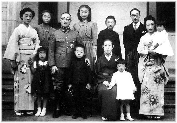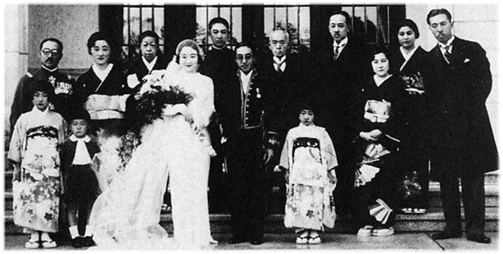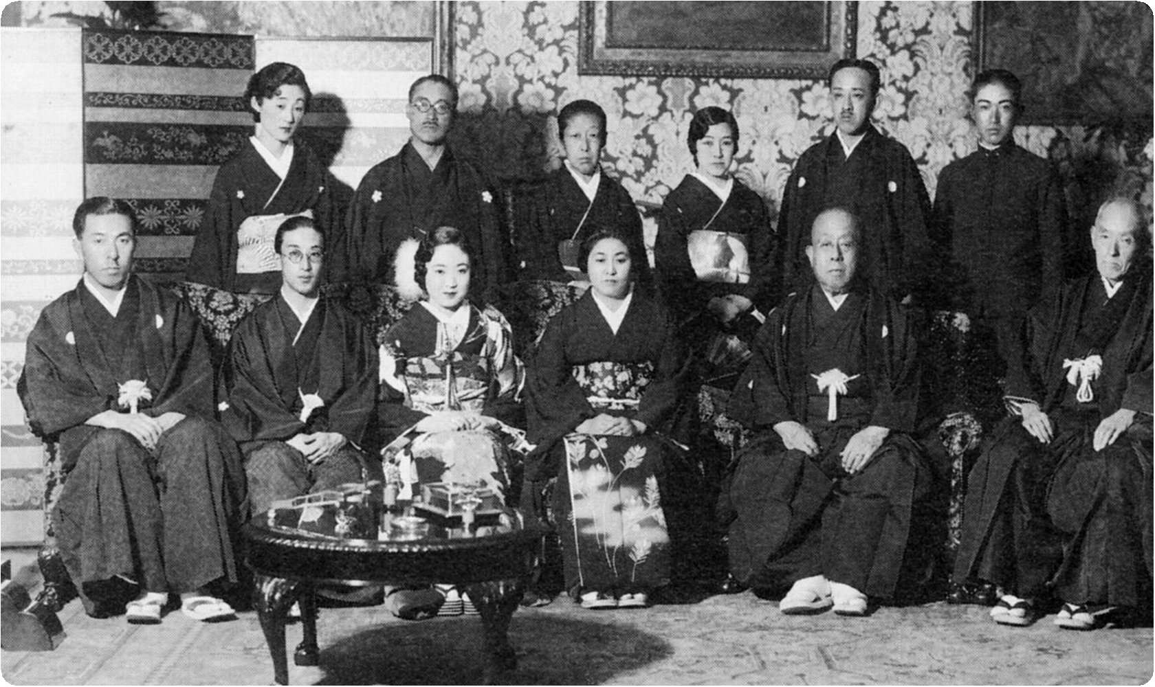 2032/11/01 集合写真 立つ左から 前田菊子侯爵夫人 前田利為侯爵 前田朗子 黒田茂子侯爵夫人 黒田長礼侯爵 黒田長久 座る左から 近衛文麿公爵 前田利建 黒田政子 近衛千代子侯爵夫人 徳川家達公爵 男性 中央 利建&政子夫妻 左側 利為&菊子夫妻 右端 仲人の近衛文麿夫妻 左側 利為&菊子夫妻 右側 利建&政子夫妻 椅子 朗子夫人